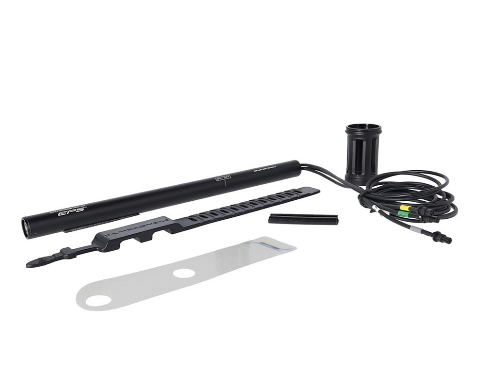 Schaltwerk, Umwerfer, Schalthebel, Interface und Power Unit Akku werden mit den elektronischen Kabeln geliefert. Diese sind ausreichend fuer Rahmengroessen bis 63 cm. Fuer die Montage des Akkus, Power Unit, im Sattelstuetzenrohr, wird zusaetzlich das Kabel Kit Art Nr: AC12-CAADSPEPS benoetigt.