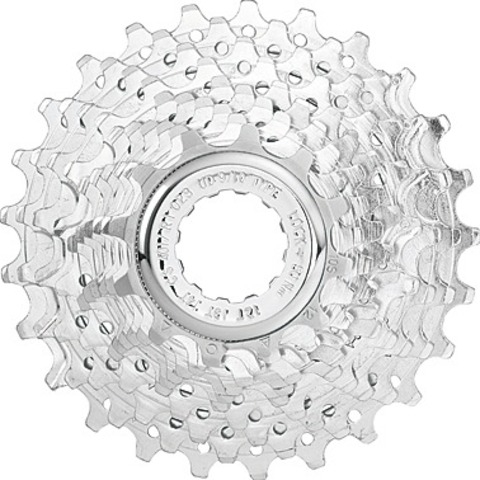 Optimierte UD Formgebung der Zaehne mit einer Behandlung, die eine hoehere Lebensdauer bewirkt. Die Formgebung der Zaehne der Campa Veloce Kassette verbessert die Geschwindigkeit und Geschmeidigkeit der Schaltvorgaenge. Mit dieser Zahnform werden die auf die Kette wirkenden Beanspruchungen reduziert, so dass sie schneller auf die groesseren Kettenblaetter aufsteigt. Die groesseren Ritzel sind in Dreiergruppen zusammengefasst und auf einen Traegerrahmen aus Aluminium montiert. Dadurch erhoeht sich die Steifigkeit und die einzelnen Ritzel sind um 70Prozent verwindungssteifer.