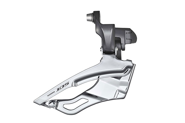 Der Shimano 105 Umwerfer FD5703 mit 31,8 Rahmenklemmschelle und fuer 3 fach Kurbeln mit speziellen Kettenleitblechen fuer die groessere 3 fach Abstufung. Dieser Umwerfer wird mit Adapter auf 28,6 mm fuer die Schelle geliefert