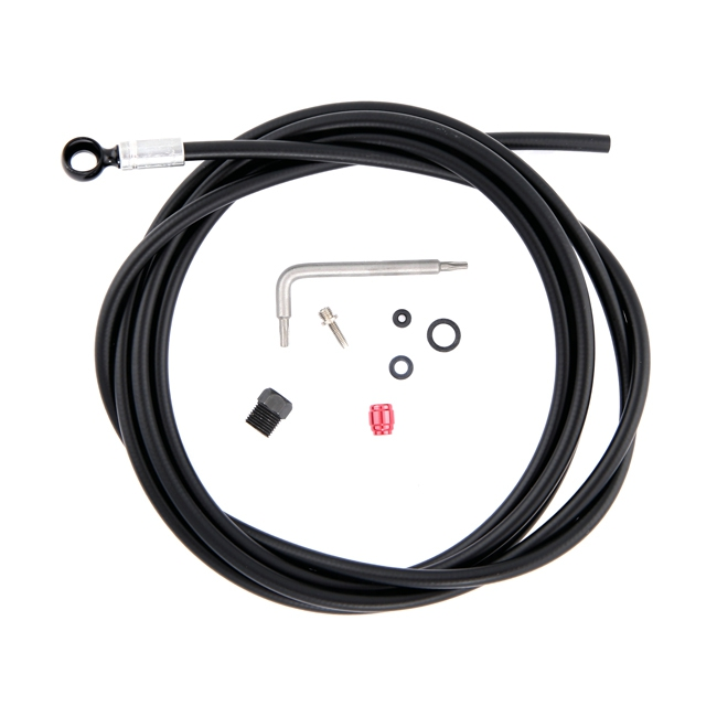 Eine Bremsleitung 200 cm schwarz, mit 90 Grad Anschluss, Klemmringe, Nippel und Kleinteilen fuer Red eTap HRD, Sram S900 TT Aero HRD Gruppen. Diese Bremsleitung ist nicht mit den Bremssaetteln mit Banjo oder geraden Leitungsanschluss kompatibel.